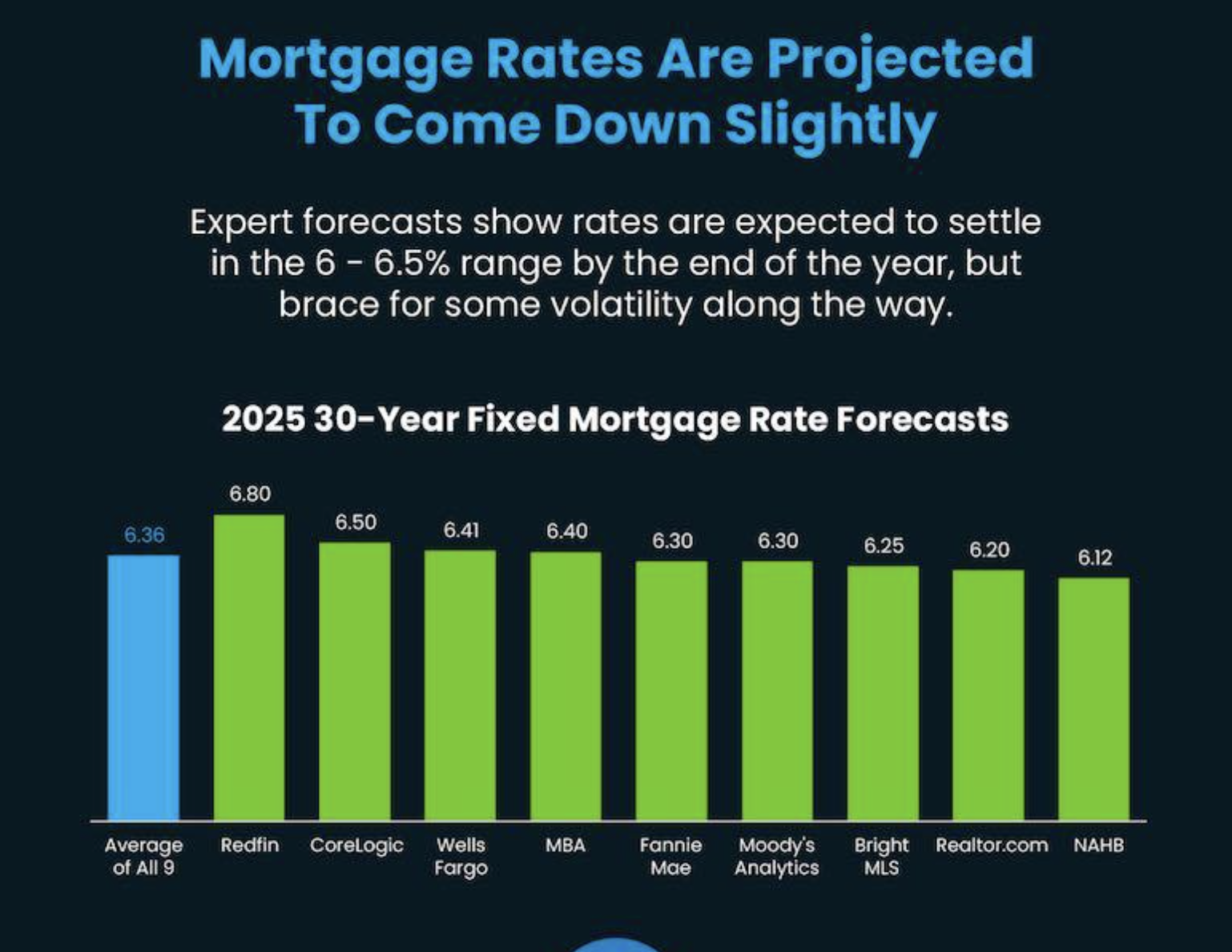 Interest Rates: Many experts forecast that mortgage rates will stay in the 6% to 7.25% range for most of 2025. To stay in this range, economic growth in the country must remain positive, avoid recession, and not show signs of re-inflation.